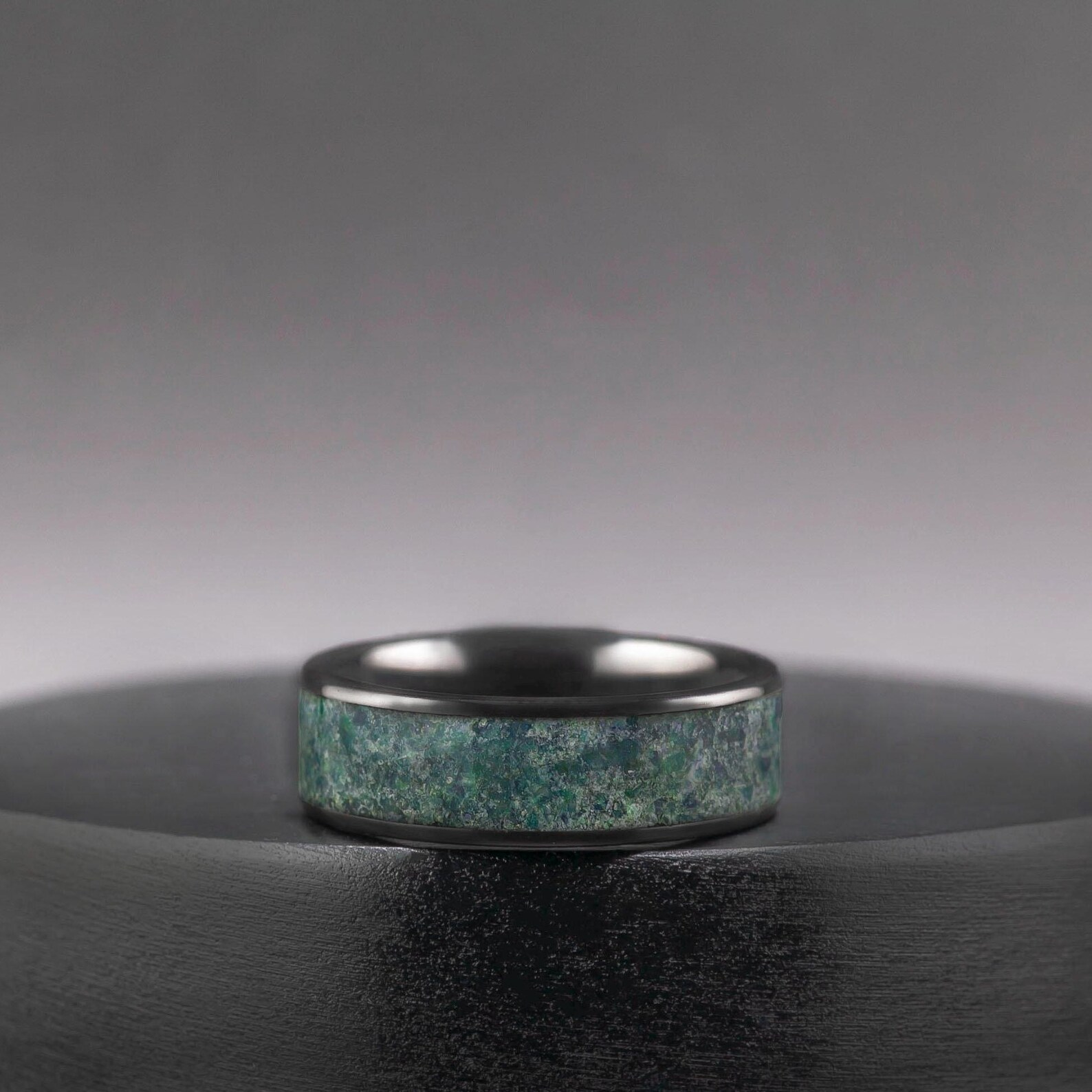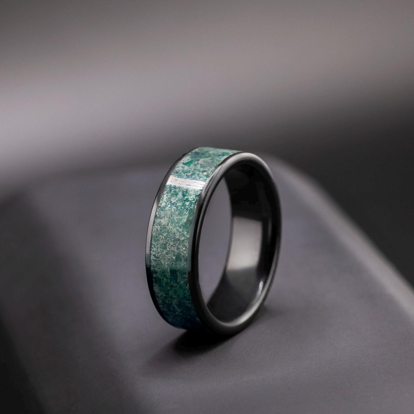 This black ceramic men’s wedding band blends bold design with natural elegance. Featuring a stunning inlay of Green Moss Agate Stone, this organic wedding band captures the raw beauty of nature within a sleek, modern frame. The durable ceramic band is highly scratch-resistant, lightweight, and built for everyday wear.
