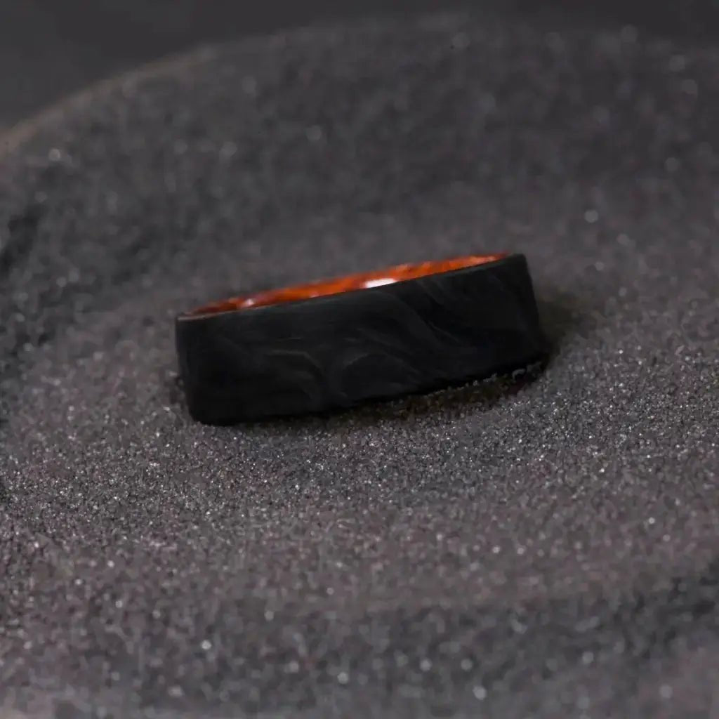 The forged carbon surface gives each ring a distinct, organic pattern, while the snakewood lining adds rich color and a smooth, comfortable feel. Designed for durability and everyday wear, this ring stands out without being overstated.